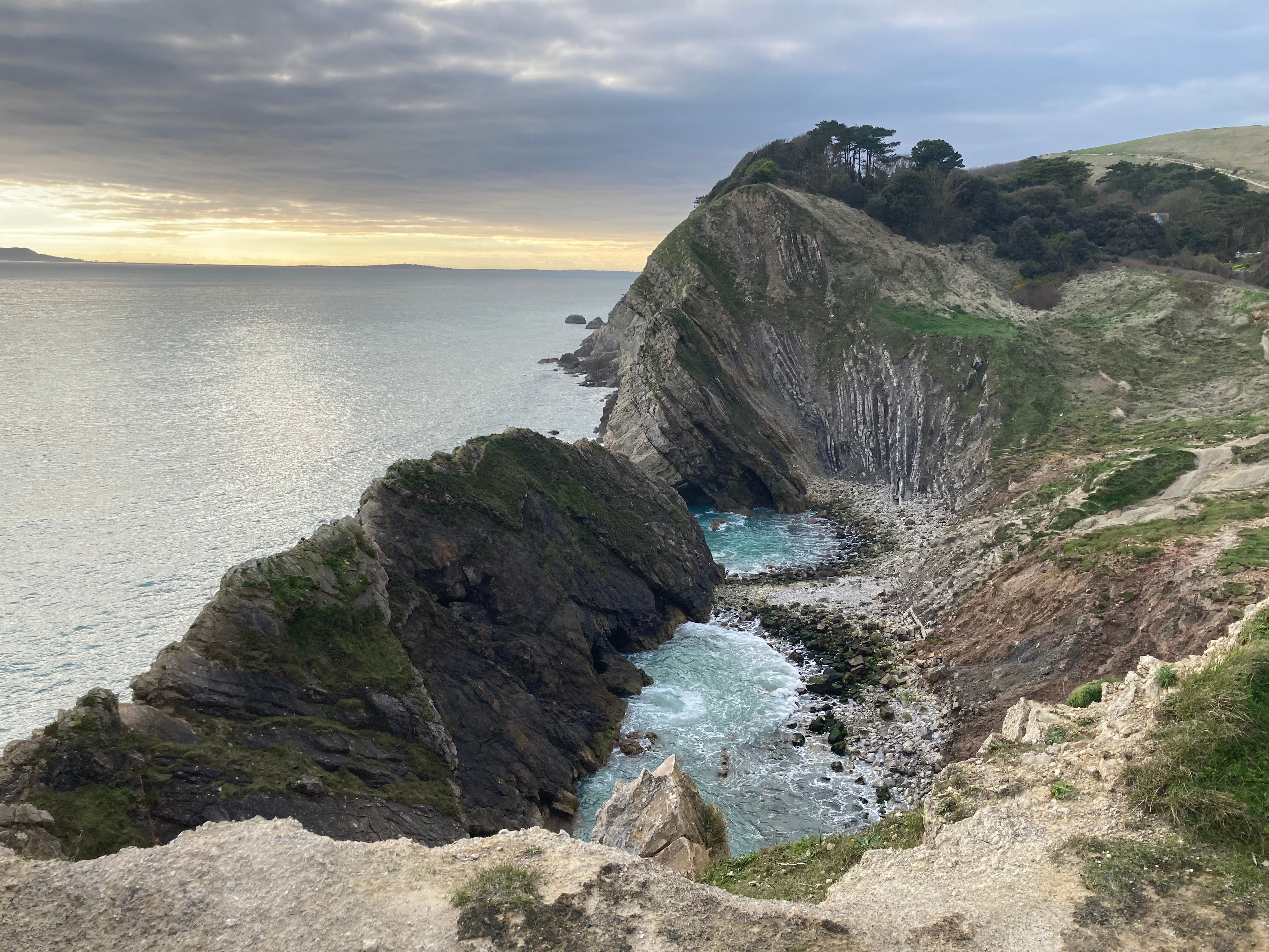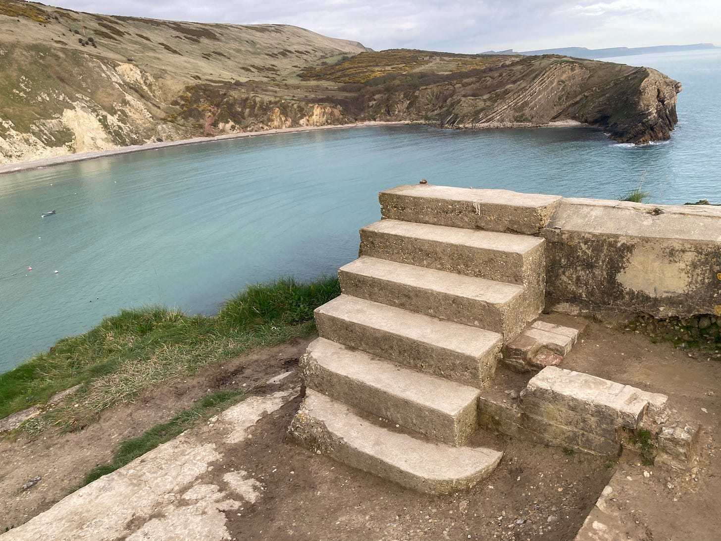 The tide is high and I climb up, onto the cliff between the bay and stair hole, the caverns on the other side. There is a pale stone staircase climbing into the sky then stopping, abruptly, steps to nowhere. I climb it, of course. In a story, these steps would lead somewhere. Perhaps at the top I would vanish. As it is I can see the silver light on the sea, the Isle of Portland jutting out on the horizon, and all the blue, all the shades of it, from barely there to almost green. I follow round, to stair hole, where the waves boom into craggy holes in the cliffs. Then I follow a road up the hill, further, past hidden houses till I get to the footpath that goes to the base of the quieter cliffs.