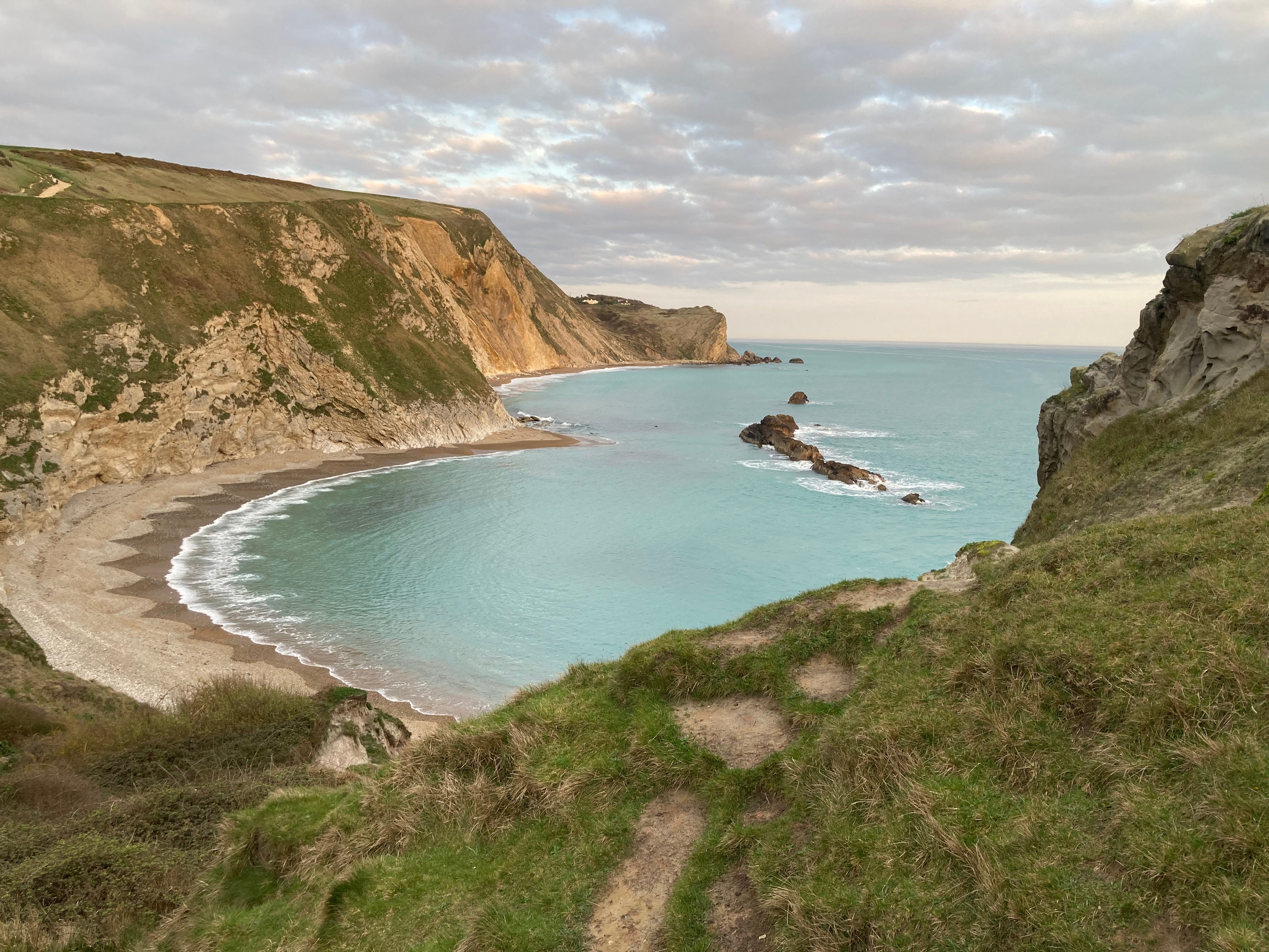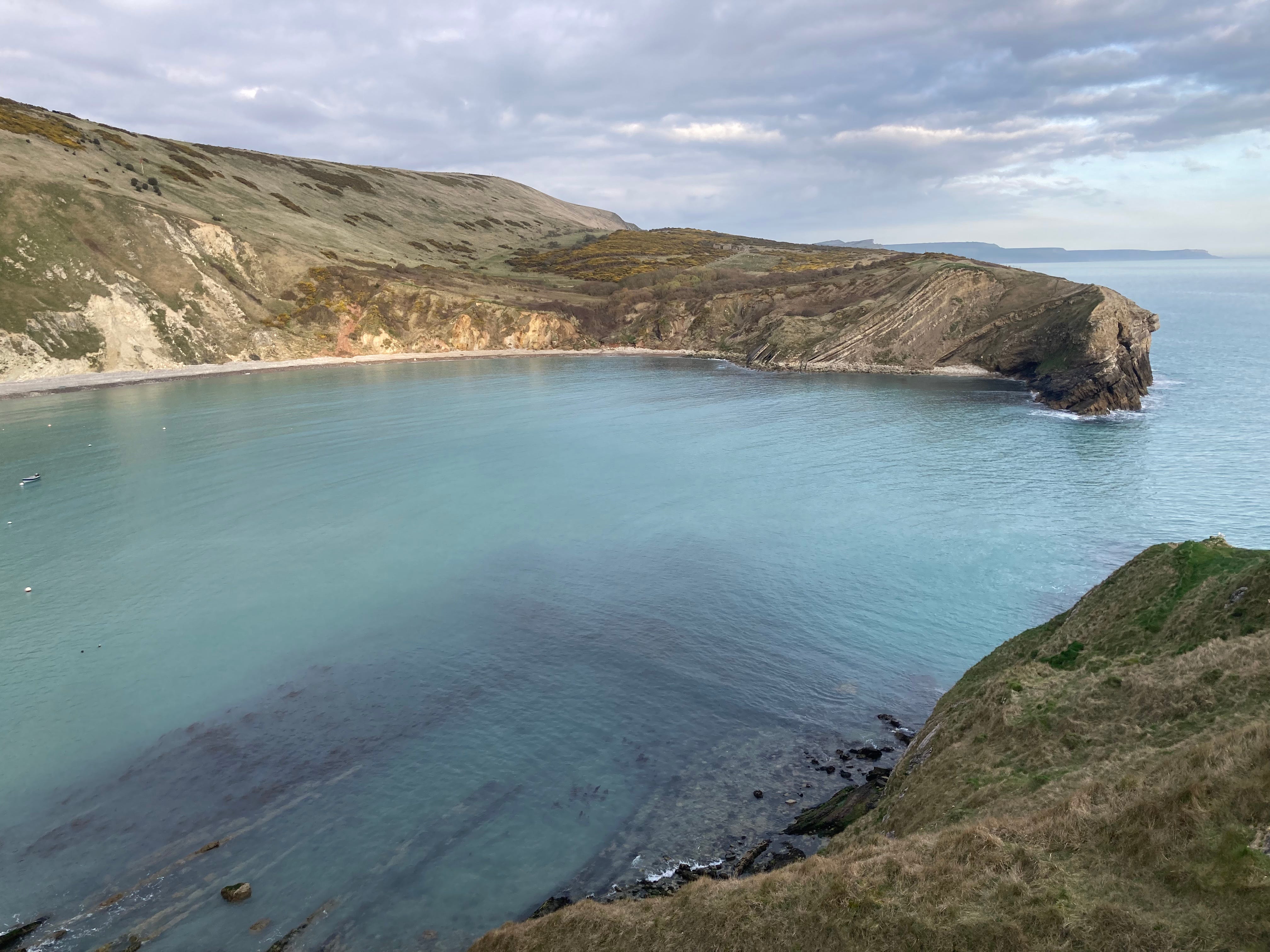 Lulworth is a perfect turquoise circle, the unstable cliffs folded, strata lines preserved like splayed pages of a book. Sandy, pale, enormous; the rocks could fall and crush us at any moment. The way the cliffs here have moved, the lines of sediment that once would have been horizontal now swooping, tipped on their sides, makes it clear that the steady ground is no more than an illusion.