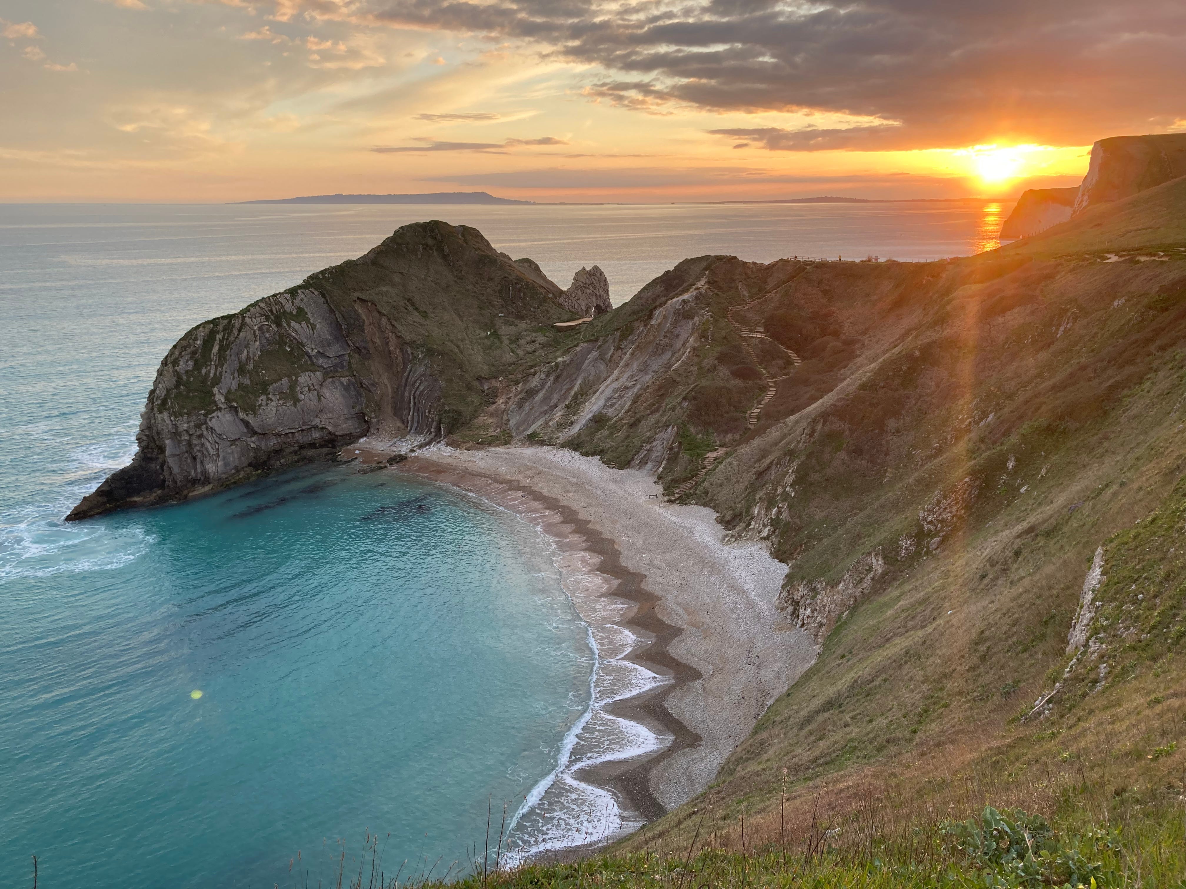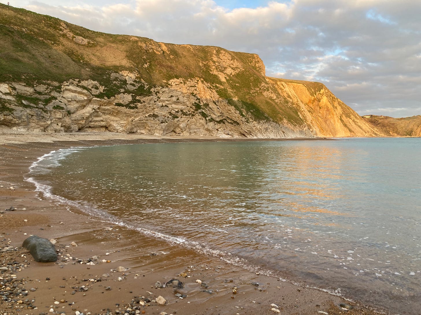 Instead, I drive up to the cliff top carpark. I walk down to Durdle Door, the iconic rocky arch, but I turn away from that beach, where photographers are lining up to catch the sunset, couples lounging on the steps down, phones out. I turn instead to the other side of the headland - Man O War bay. This beach, unlike the others, is empty. It is equally beautiful. The water is flat, sheltered by the headland, which has those same collapsing lines scored through it, record of its history, its transformation. There is a reef off shore and white waves break over it, crashing and shushing, but at the shoreline the water is still. I change and go in.