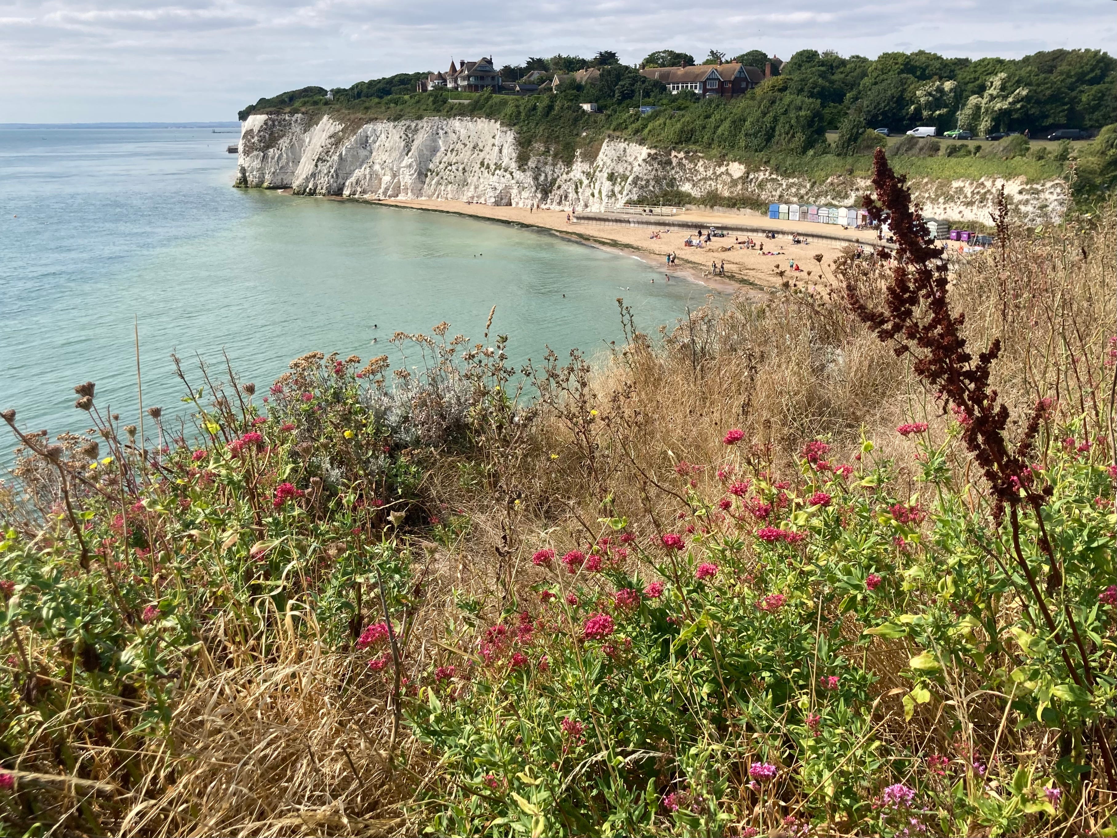 The beach is busy, even the quiet one where, at low tide, the chalk caves are slimed with green and knobbles of white stick up through the sand like knuckles. Today, the tide is right in, pressing against those chalky cliffs, covering the end of the ramp, walkway giving way to ocean.