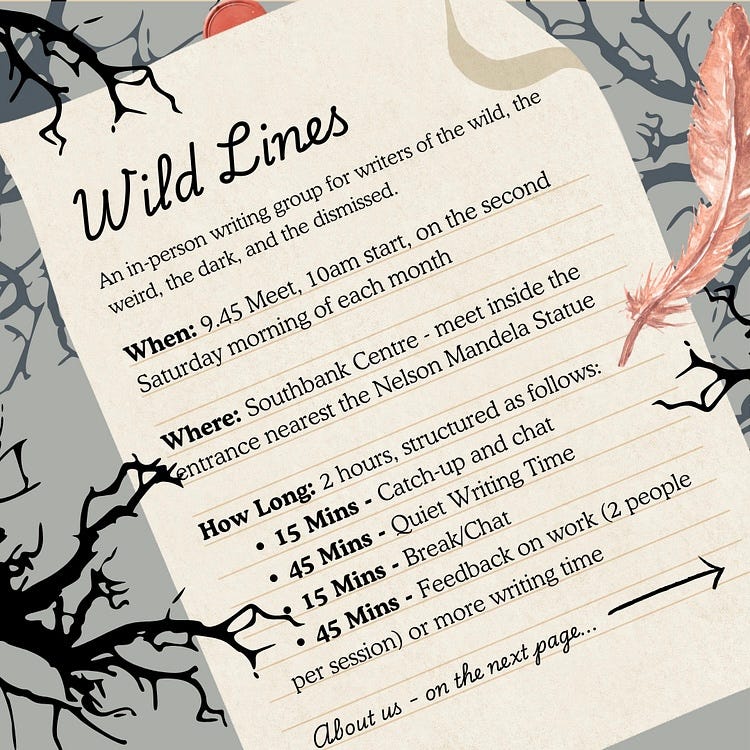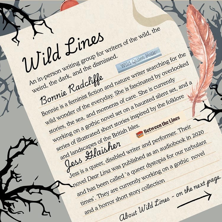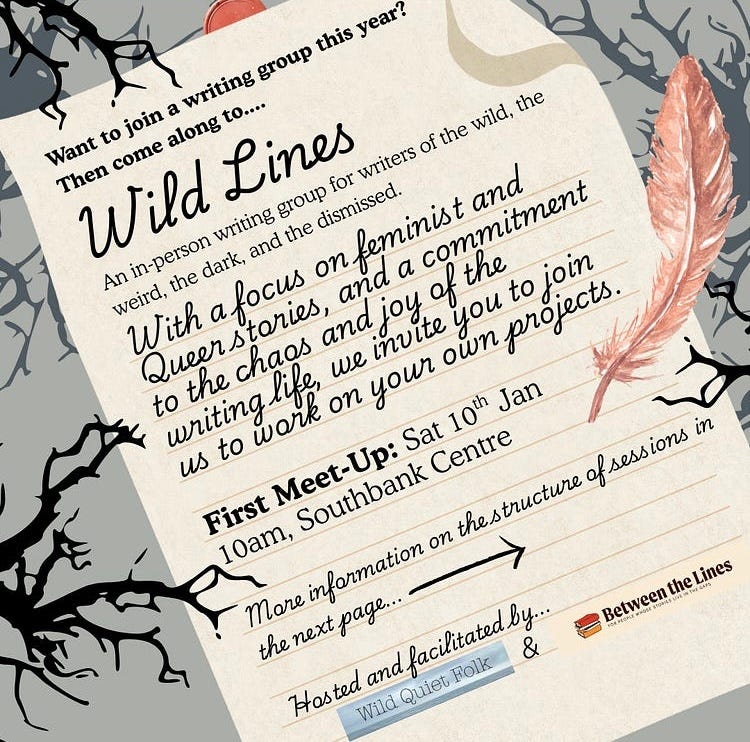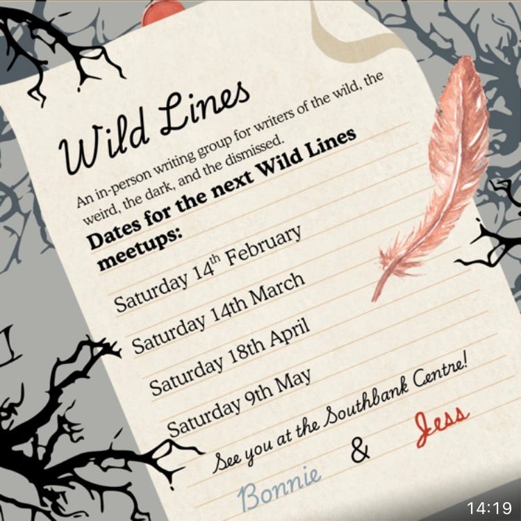 In aid of this, Jess Glaisher and I have begun the writing group we have always wanted. An in person writing group for writers of the weird, the wild, the dark and the dismissed. With a focus on Feminist and Queer stories, and a commitment to the chaos and joy of the writing life, we invite you to join us to work on your own projects.