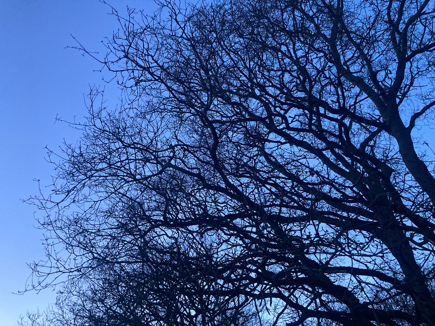 One single brown leaf left on otherwise bare branches. The day getting light, slow, impossible to pinpoint, one moment blue, they grey, then day. The treacle-thick leaf mulch in the gutter, already halfway to gone, no longer made of many separate things, close to becoming one. Tarmac cracking around the roots of trees it cannot help to contain, the great swell of the ground. The round balls of seed pods, strung like baubles overhead. The red of leaves of a hedge pressing through the blue bars of the fence. Heather in planters outside the factory. My breath in a plume in front of me.